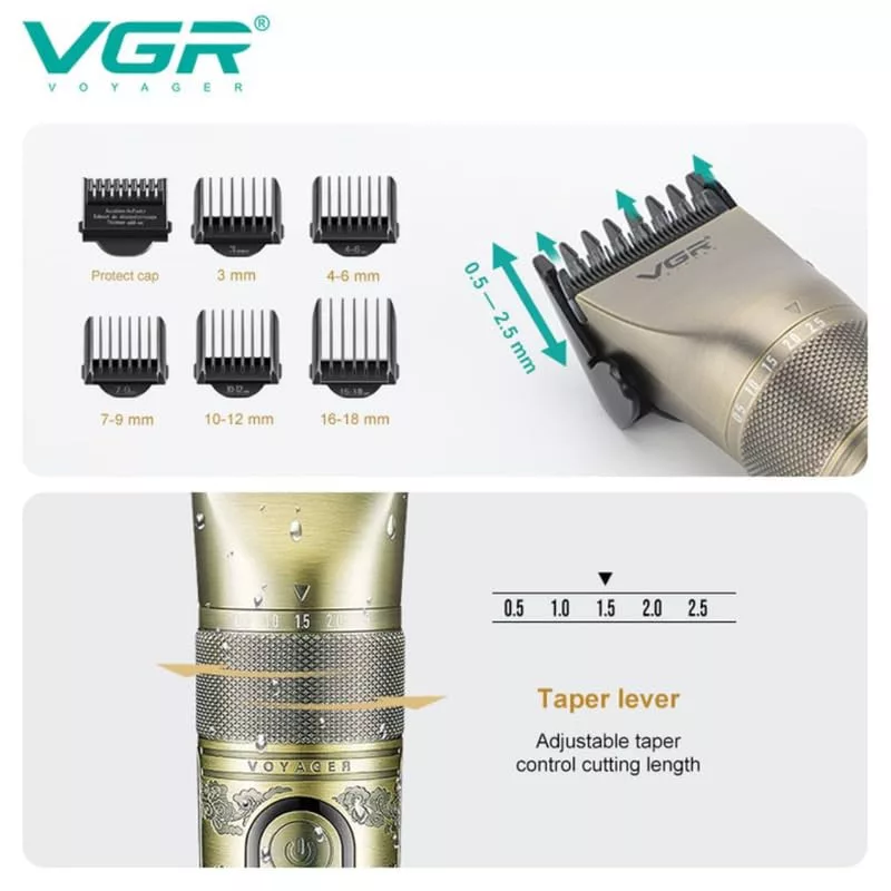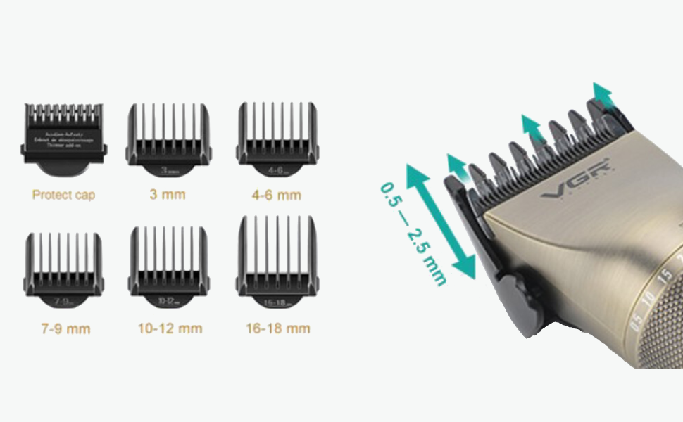 Állítható vágáshosszA beépített Zoom Wheel állítókerék segítségével a vágási hossz 0,5 mm és 2,5 mm között állítható fésűfeltétek nélkül.A csomag 5 darab vezetőfésűt tartalmaz: