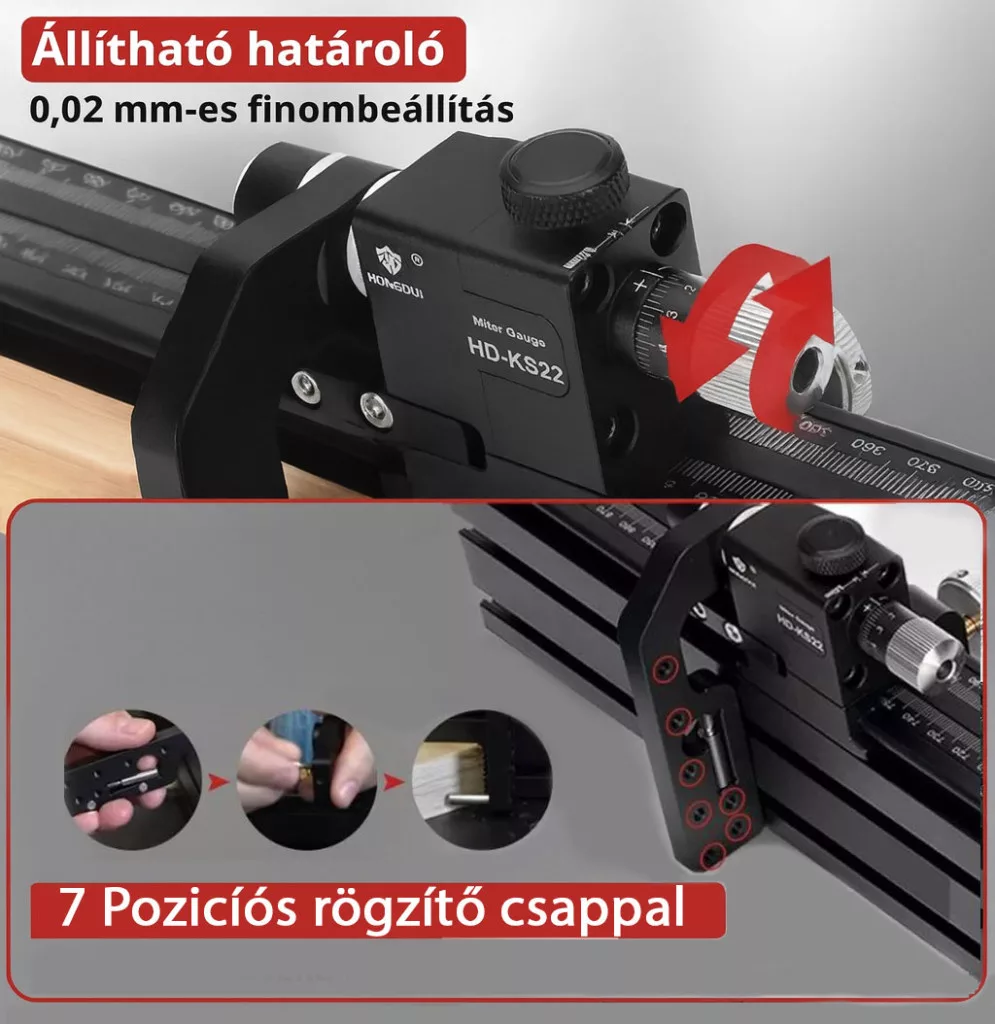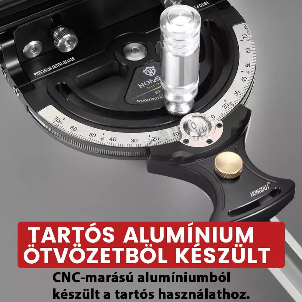 A HONGDUI HD-MG21 egy precíziós derékszögmérő (miter gauge) asztali fűrészekhez — különösen alkalmas faipari és barkácsmunkákhoz, ahol pontos, ismételhető vágásokra van szükség.