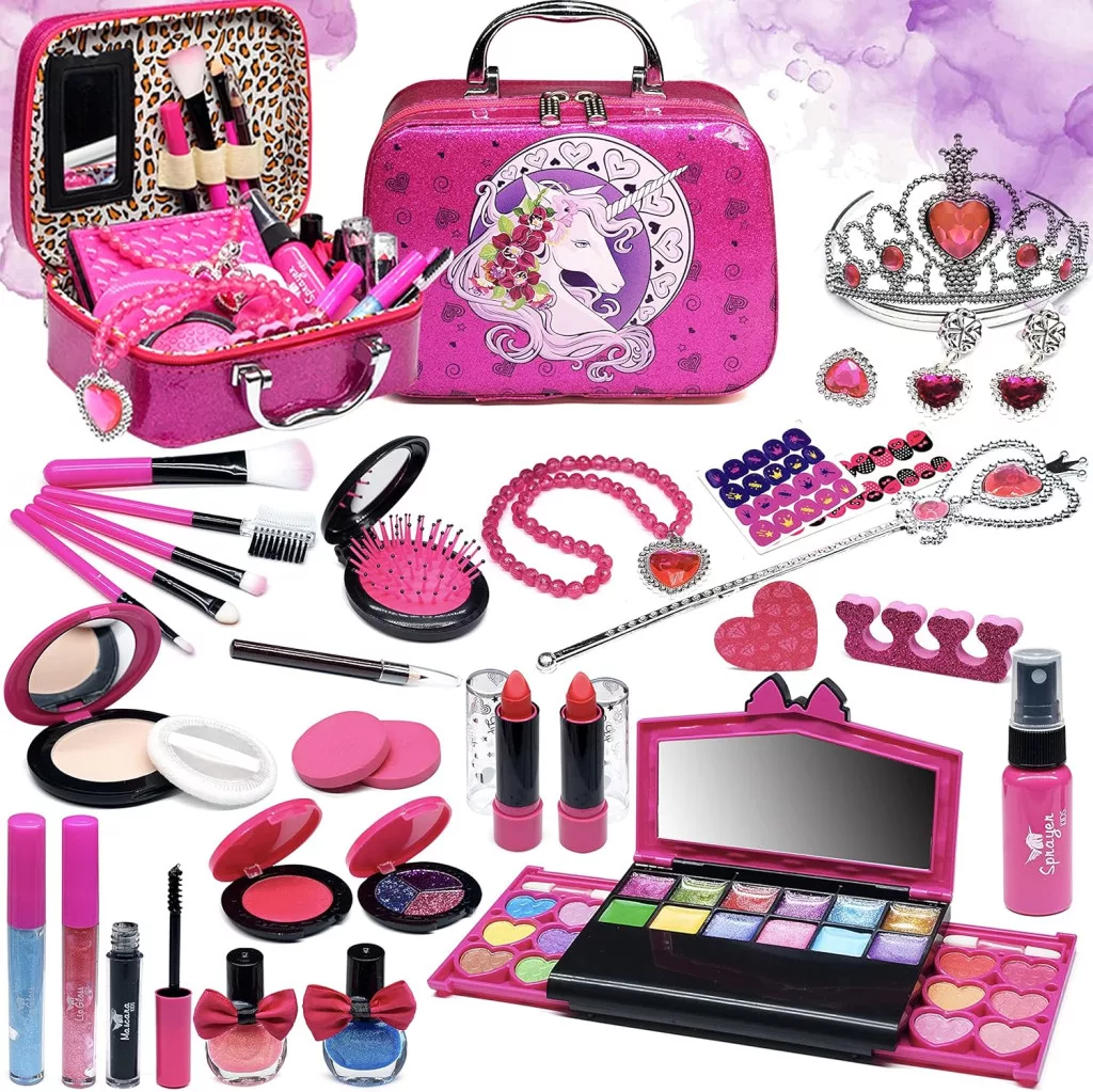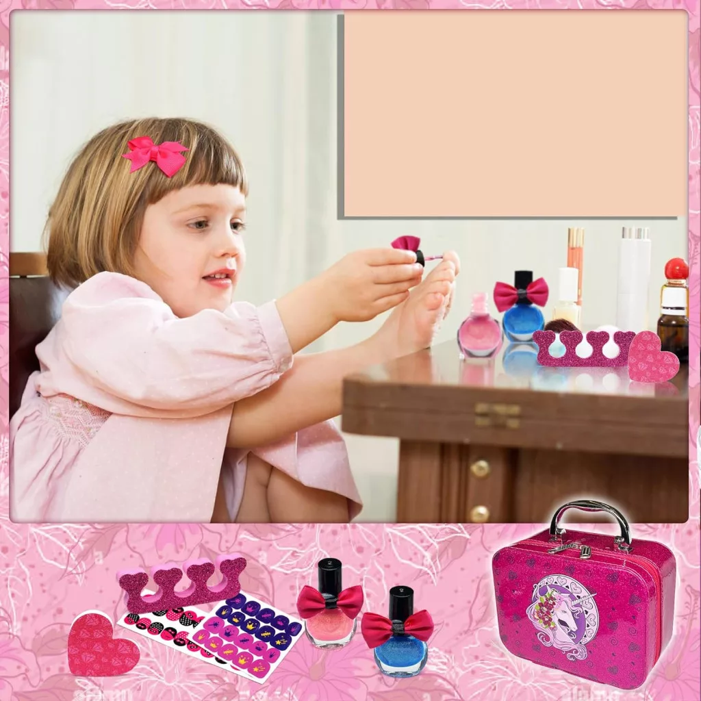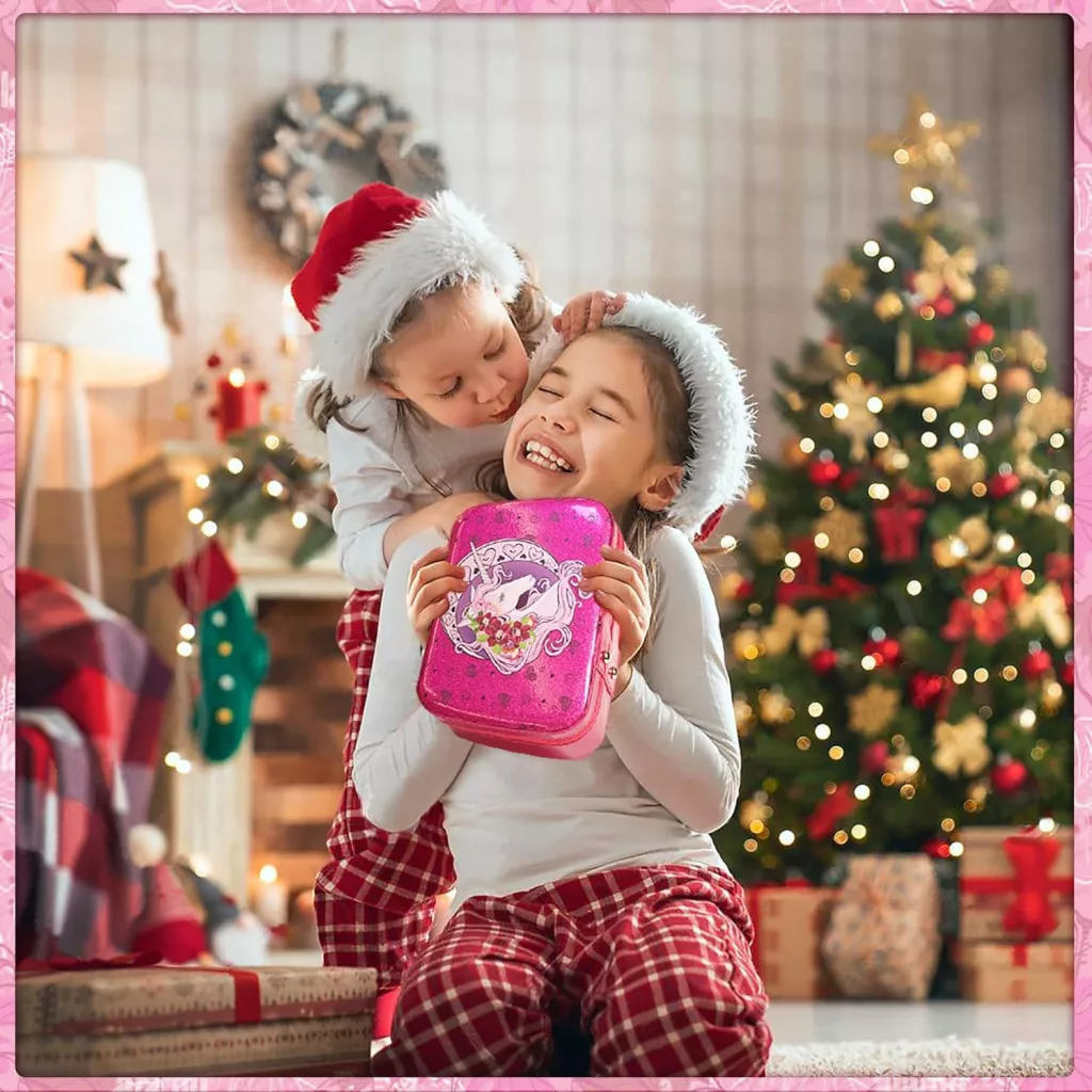 Elegáns sminktáskávalA készlet nemcsak sminkeket, ecseteket és kiegészítőket tartalmaz, hanem egy gyönyörű, kislányok számára tervezett sminktáskát is, amely egy igazi varázslatos kincsesládára emlékeztet. A táska könnyen hordozható, így a gyerekek bárhová magukkal vihetik.
