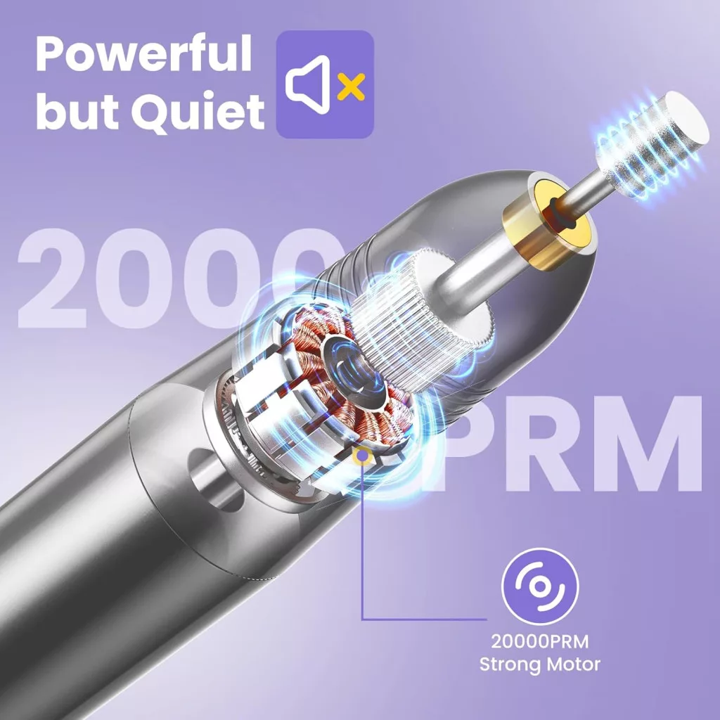 Erős, mégis halk működés – A magas minőségű alumínium ház és a fejlesztett motor alacsony zajszintet, rezgést és hőtermelést biztosít, így a használat még hosszabb ideig is kényelmes marad. A körömcsiszoló gyorsan és fájdalommentesen távolítja el a lakkot és az egyéb rétegeket, anélkül, hogy károsítaná a körömfelszínt.