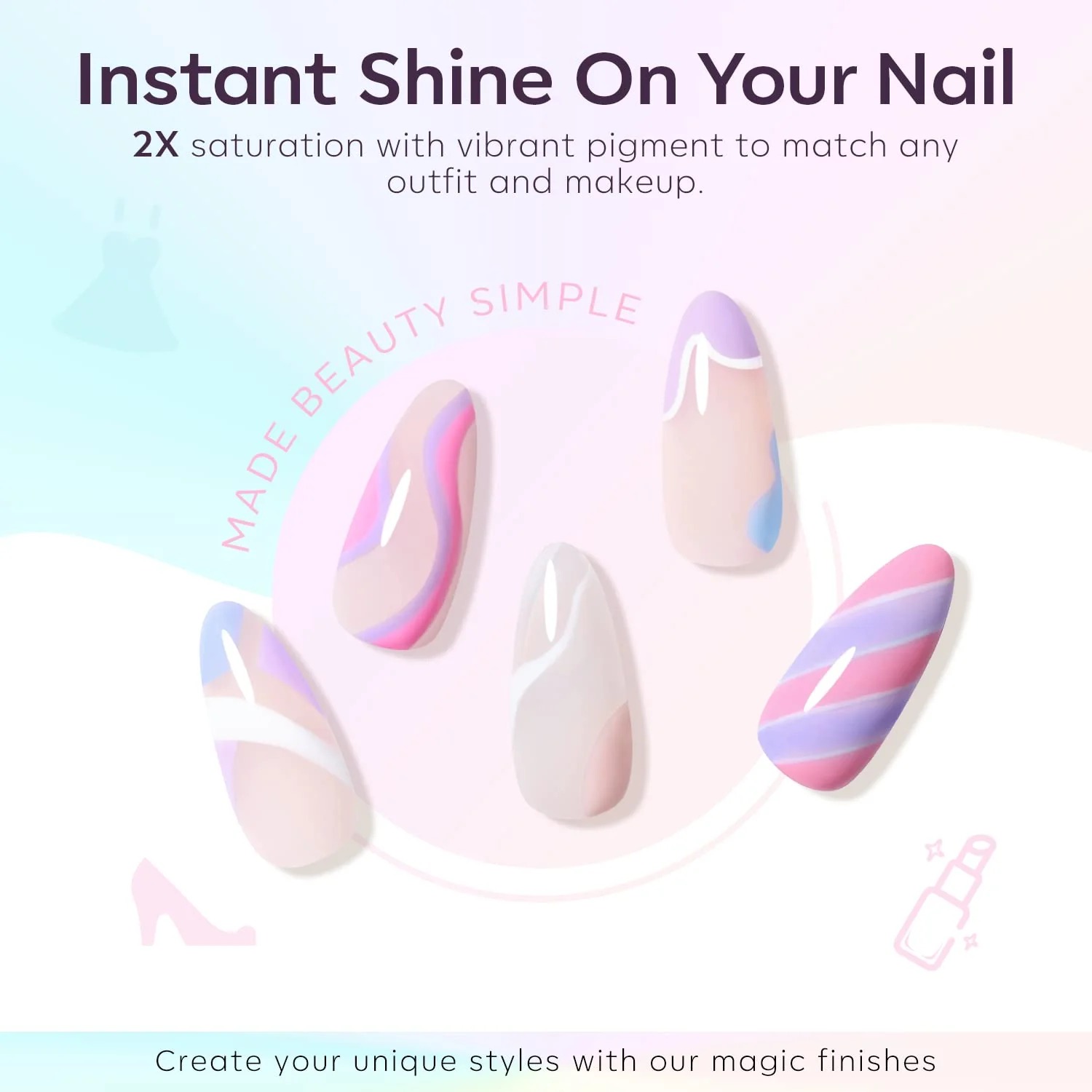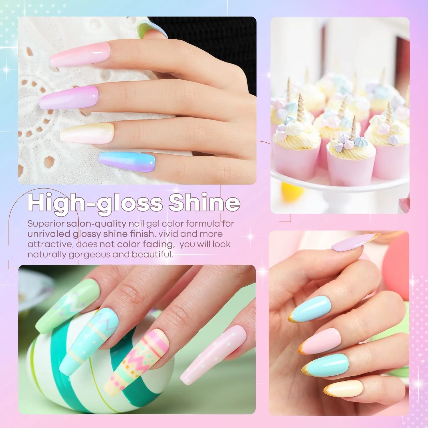 A készlet minden árnyalata gondosan válogatott, hogy lépést tartson a legújabb körömdivattal. A pasztellkék, rózsaszín, levendula, mentazöld és vaníliasárga tónusok friss, játékos és elegáns megjelenést kölcsönöznek – tökéletes választás bárkinek, aki szereti a különleges színkombinációkat.