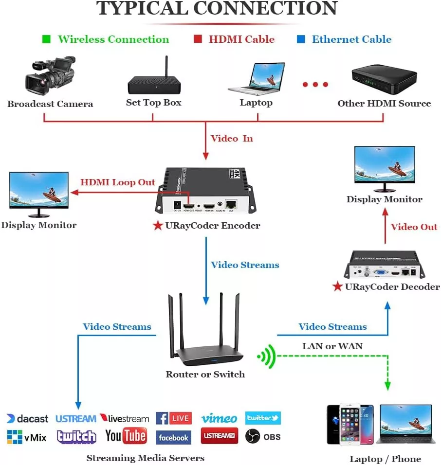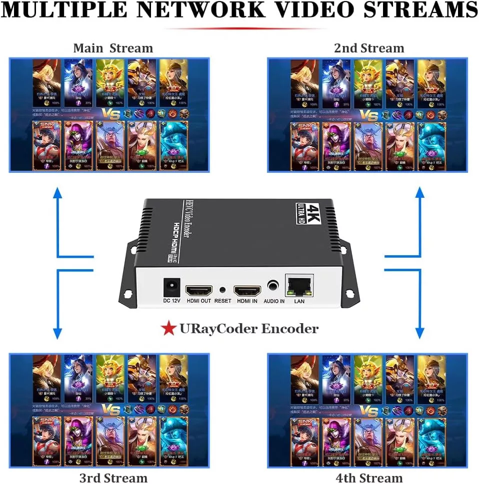 A URayCoder UHE265-1L-4K egy hardveres HDMI → IP video encoder, amely egy HDMI-s eszköz (kamera, laptop, lejátszó) képét és hangját élő internetes közvetítéssé alakítja.Számítógép nélkül képes YouTube-ra, Facebookra, OBS-be és más streaming szerverekre közvetíteni, akár 4 platformon egyszerre.