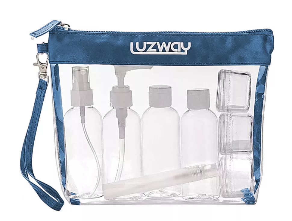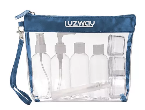 A képen utazáshoz / kozmetikumokhoz való üres flakon- és tégelyszett látható, fehér háttéren, egymás mellé rendezve.