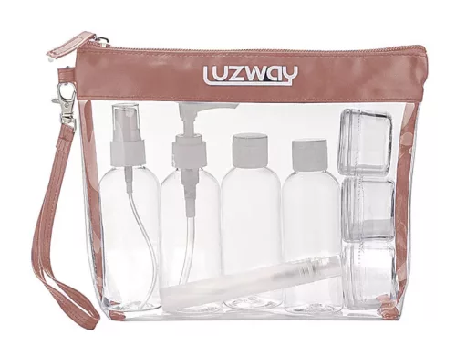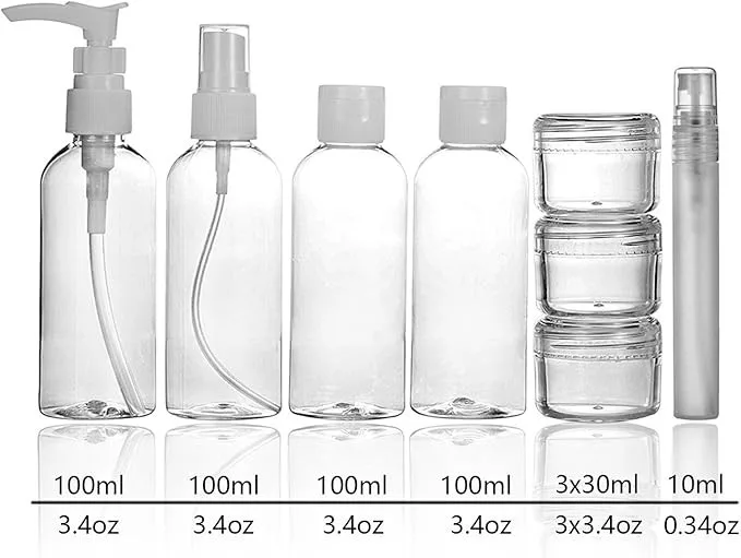 A képen utazáshoz / kozmetikumokhoz való üres flakon- és tégelyszett látható, fehér háttéren, egymás mellé rendezve.