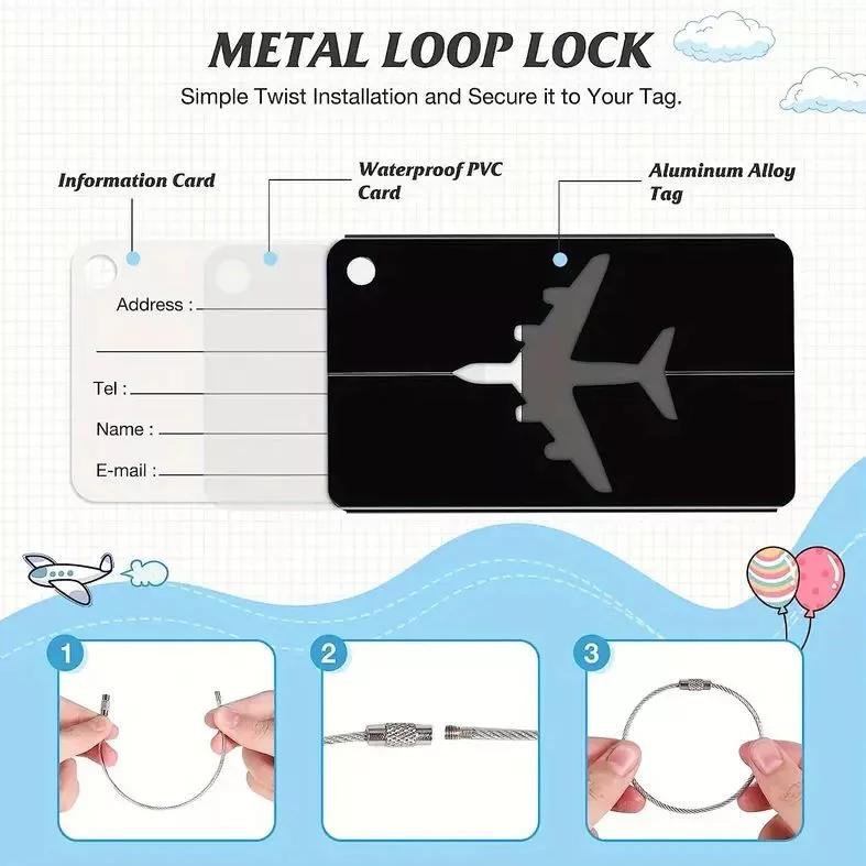 A poggyászcímkék alumíniumötvözetből készülnek, amely rendkívül erős, tartós, nem hajlik és nem törik.A csavaros rozsdamentes acél rögzítőkábel biztonságos, nem csúszik le és megakadályozza a véletlen leesést.