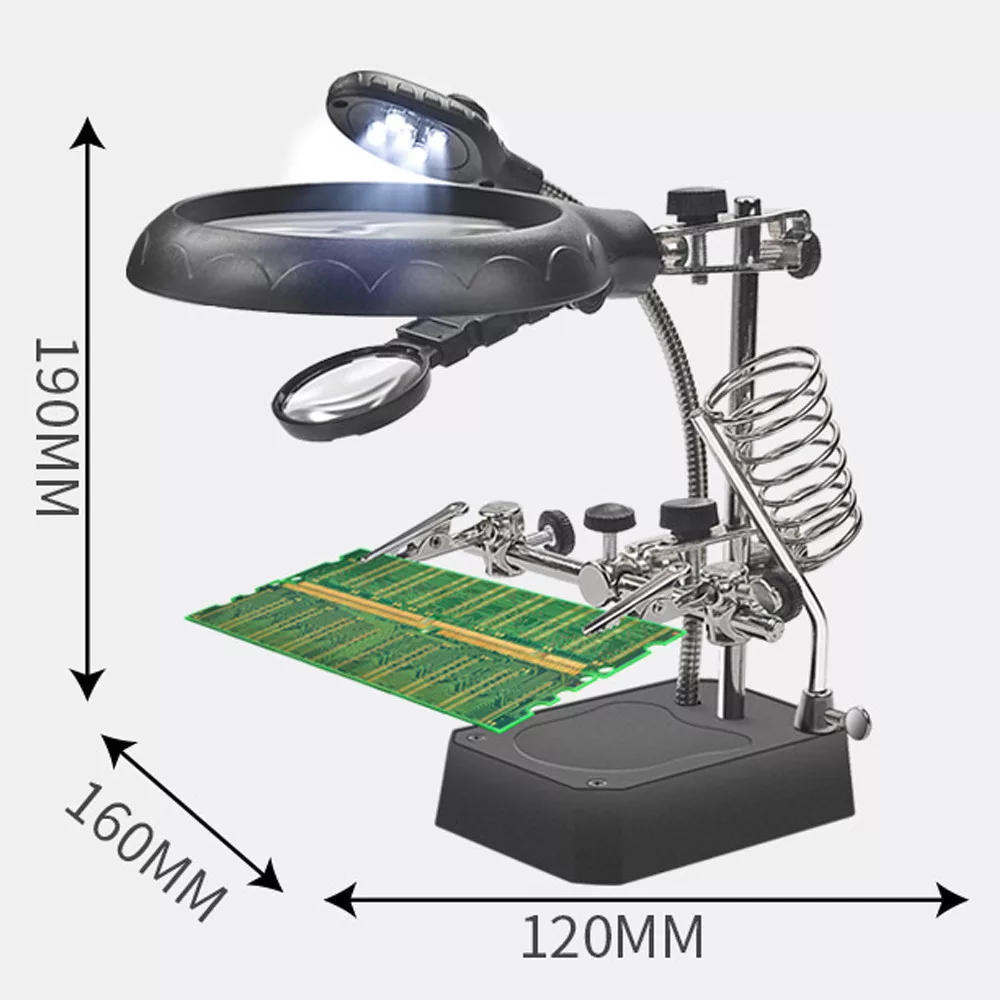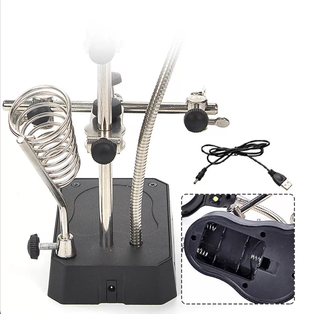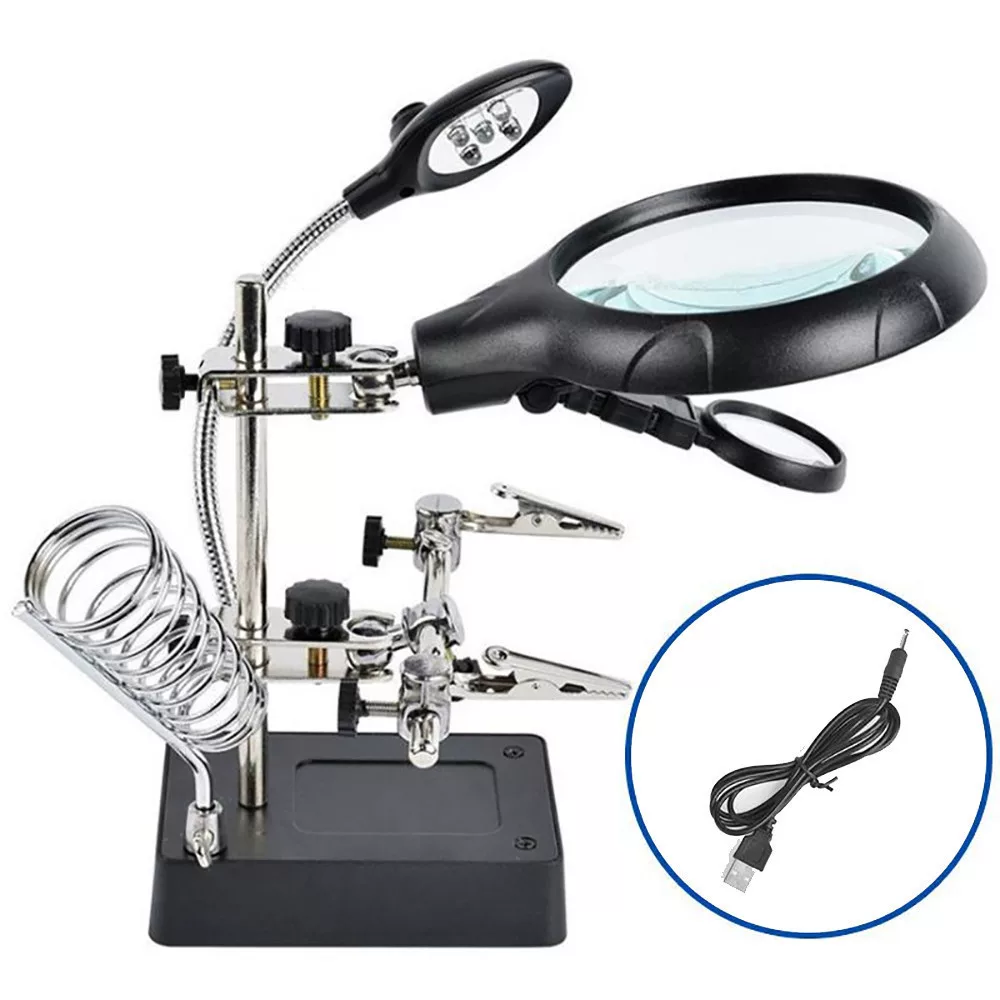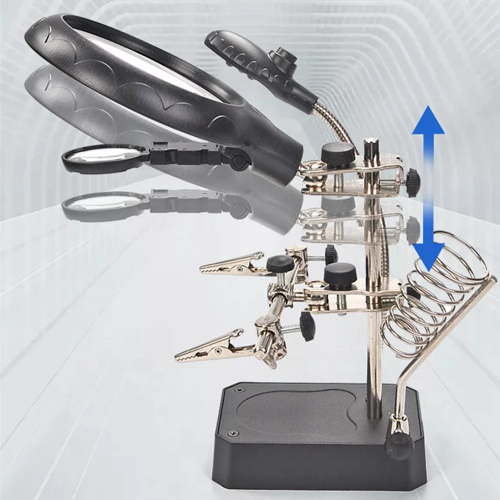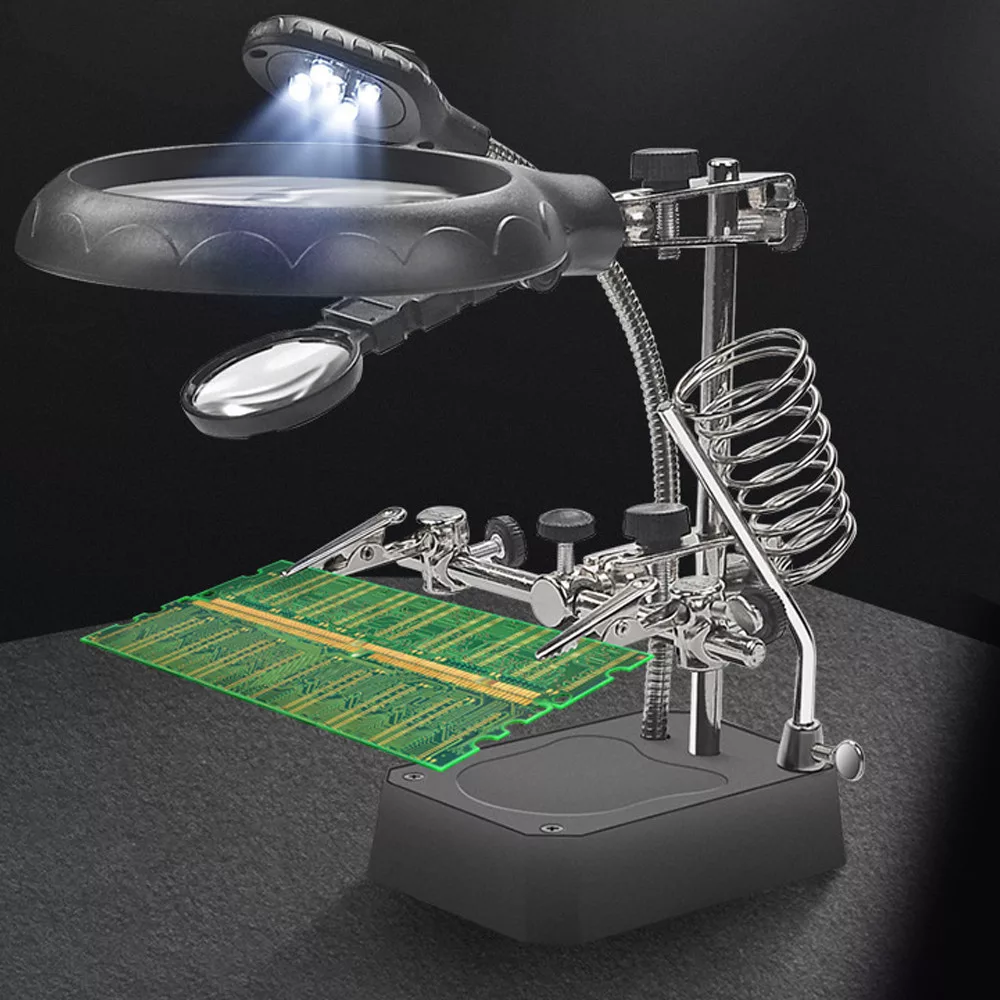 Zväčšovacia stolová lampa s pomocnými rukami, pomocnými klieštikmi, stojanom s krokodílími svorkami, súpravami na opravy pre prácu v blízkom zábere.