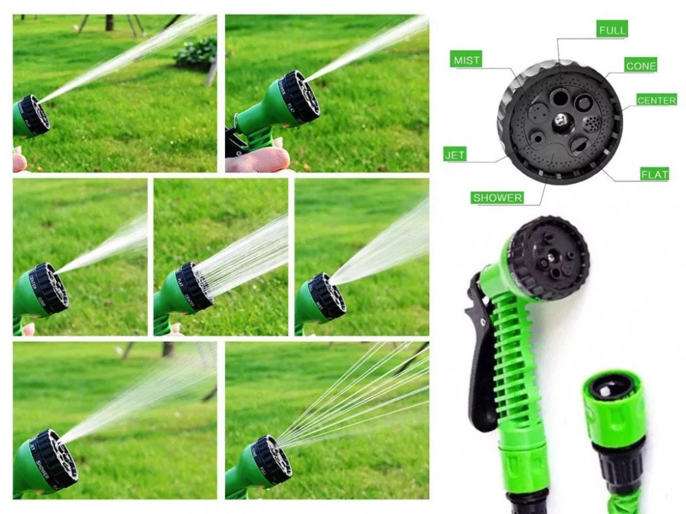 Vynikajúca kvalita sprchové hlavice s flexibilnou hadicou, ktorá sa sama sťahuje. Ľahko môžete regulovať silu prúdu vody a typ rozprašovania. Naplnená vodou sa hadica môže až trojnásobne rozťiahnuť. Kombinácia mimoriadne pružnej záhradnej hadice a vynikajúcej kvality a mimoriadne odolného tkaniva zaručuje dokonalú pružnosť hadice. Ideálne na záhradné práce, umývanie áut, čistenie kobercov a podláh.