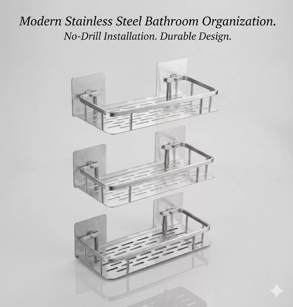 3 szintes fali fürdőszobai polc – fúrás nélkül, öntapadós rögzítéssel